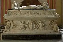 - ↑ Les deux gisants sur la table noire sont vêtus de robes semées de fleurs de lis et de dauphins, accompagnés de quatre angelots qui soutiennent les coussins et les armoiries des princes.