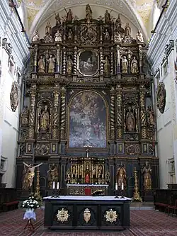 - Le maitre-autel est un spectaculaire chef-d’œuvre de style baroque primitif. Il occupe toute la hauteur du mur du chevet. L’architecture en bois à colonnes est haute de 20 mètres et large de 14 mètres : plusieurs sculpteurs sur bois furent mis à contribution. De nombreuses colonnes dorées divisent l’ensemble verticalement, créant des niches pour les saints et des tableaux. Des corniches le divisent horizontalement en quatre étages. Le deuxième étage, juste au-dessus de la table d’autel, est dominé par la peinture illustrant le 'baptême de Jésus au bord du Jourdain'. Tout l’ensemble est polychrome.