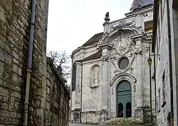 La cathédrale Saint-Jean de Besançon, aussi appelée cathédrale Saint-Jean Saint-Étienne de Besançon[1], est une église, basilique et cathédrale carolingienne franc-comtoise à Besançon, construite au IIIe siècle puis reconstruite plusieurs fois, notamment au IXe et XIe siècles ; elle comprend des parties romanes, gothiques et baroques. L'édifice est l'un des rares en France à comprendre deux chœurs opposés[Note 1] ; il recèle une trentaine de tableaux classés aux monuments historiques, une horloge astronomique considérée comme un chef-d'œuvre du genre, ainsi que la Rose de Saint-Jean, un autel circulaire datant du XIe siècle et entièrement réalisé dans du marbre blanc.