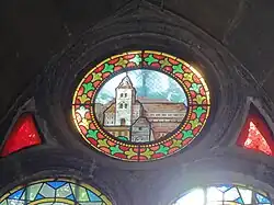 Deux de ces dernières soulignaient du côté oriental la travée qui était encadrée de deux tours et la troisième située au centre de la nef marquait de façon visible la coupure entre le chœur des chanoines situé à l'ouest avec l'espace réservé aux laïcs à l'est[18]. Les deux parties de la nef comptaient chacune douze colonnes disposées selon une symbolique du Moyen Âge censée représenter les douze apôtres et les douze prophètes, piliers de l'église au sens propre comme au sens figuré[18].