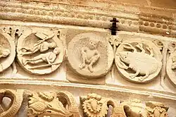 Le tympan est bordé sur l'extérieur par une série d'une trentaine de médaillons circulaires, où alternent des scènes de saison et des signes astrologiques. De gauche à droite, et dans le sens des aiguilles d'une montre, on y reconnaît :