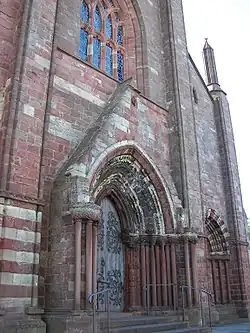 La cathédrale romane commencée en 1137 comporte de beaux exemples d’architecture normande attribués à des maçons anglais qui ont peut-être travaillé à la cathédrale de Durham. La maçonnerie utilise du grès rouge extrait près de Kirkwall et du grès jaune de l’île d’Eday, souvent en alternance ou en forme de damier de façon à donner un effet polychrome.