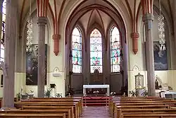Son plan est à trois nefs divisées par des colonnes de granite. L'abside à l'orient accueille le maître-autel.