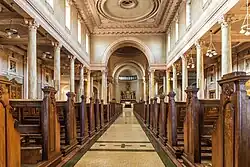 Le plan est basilical. Passé le narthex, la longue nef possède six travées, accompagnées de collatéraux ; la croisée du transept est entourée de quatre groupes de quatre colonnes, qui soutiennent un dôme. Les vingt-huit colonnes ont été réalisées en marbre par la firme italienne de Dinelli Figli, basée à Pietrasanta, tout comme le pupitre (côté sud) et le statuaire. Le maître-autel est quant à lui en marbre vert du Connemara et en marbre rose de Middleton[1], et les rails d’autel — elle est la dernière cathédrale[2] cathédrale a ne pas les avoir retiré à la suite du concile Vatican II — sont en marbre blanc de Carrare.
