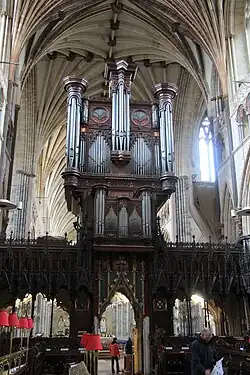 L'orgue d'origine a été construit en 1665 par John Loosemore. Il a été entièrement rénové une première fois en 1891 par Henry Willis, puis en 1931 par Harrison & Harrison.
