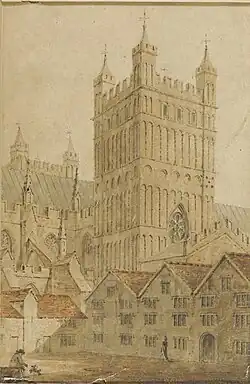 La fondation de la cathédrale d'Exeter, dédiée à saint Pierre, date de 1050, lorsque le siège de l'évêché du Devon et de Cornouailles a été transféré depuis Crediton en raison d'une crainte d'invasion par la mer. Une cathédrale saxonne qui existait déjà au sein de la ville (et dédiée à la Vierge Marie et saint Pierre), mais les offices étaient souvent tenus à l'extérieur, à proximité du site de l'actuel bâtiment de la cathédrale.