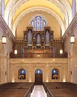 Elle est édifiée dans le style colonial espagnol, avec deux tours jumelles, plutôt que dans le style néo-gothique en vogue à l'époque, Kimball ayant justifié son choix par l'influence espagnole dans la colonisation des Amériques. Le maître-autel est en marbre de Carrare surmonté d'un baldaquin avec un immense crucifix. Les voûtes s'élèvent à 24 mètres. Les vitraux très colorés (quatre de chaque côté) ont été dessinés par Charles Connick. Les fenêtres en forme de lancette du déambulatoire dépeignent neuf saints en vitraux. Les stations du chemin de Croix sculptées en bronze décorent les colonnes de la nef.