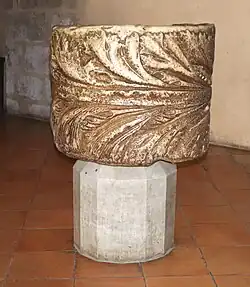 - un bénitier de marbre blanc, décoré d'une large feuille d'acanthe à l'extérieur. Taillé dans une colonne romaine, il a été cannelé en creux à l'époque romane (XIe siècle).