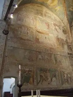 Le chœur est décoré d'un cycle de fresques du XIVe siècle, clairement dérivé de la leçon que Vitale da Bologna a laissée dans la cathédrale d'Udine. L'auteur, inconnu, est cité comme le Maître des Pavillons (it) ; ses œuvres remontent à la période 1350-1380.