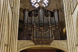 Le premier orgue[9] de la cathédrale, installé dans la cathédrale en 1488 par Dominique Castelbon, réparé par Amadis vers 1580-1590 se trouvait dans le transept au-dessus des deux portes de la sacristie. Il fut restauré ou reconstruit de 1625 à 1631 par Boysolle et le sieur Benoist.