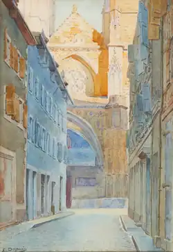 « La cathédrale de Bayonne est une assez belle église du quatorzième siècle couleur amadou et toute rongée par le vent de la mer. Je n'ai vu nulle part les meneaux décrire dans l'intérieur des ogives des fenestrages plus riches et plus capricieux. C'est toute la fermeté du quatorzième siècle qui se mêle sans la refroidir à toute la fantaisie du quinzième. Il reste çà et là quelques belles verrières, presque toutes du seizième siècle. À droite de ce qui a été le grand portail j'ai admiré une petite baie dont le dessin se compose de fleurs et de feuilles merveilleusement roulées en rosace. […] L'église est accostée au sud d'un vaste cloître du même temps, qu'on restaure en ce moment avec assez d'intelligence et qui communiquait jadis avec le chœur par un magnifique portail, aujourd'hui muré et blanchi à la chaux, dont l'ornementation et les statues rappellent par leur grand style Amiens, Reims et Chartres. Il y avait dans l'église et dans le cloître beaucoup de tombes, qu'on a arrachées. Quelques sarcophages mutilés adhèrent encore à la muraille. Ils sont vides. Je ne sais quelle poussière hideuse à voir y remplace la poussière humaine. L'araignée file sa toile dans ces sombres logis de la mort[8]. »