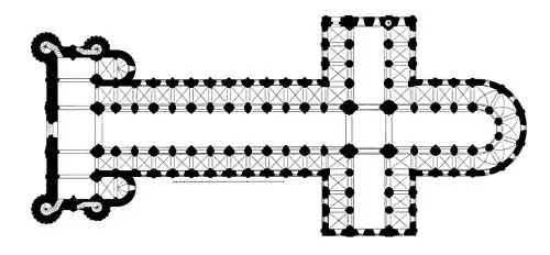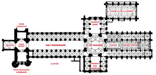 Les concepteurs redonnent à la nouvelle construction une assise plus large en enlevant les quatre piliers de la tour d'origine et en absorbant une partie des arcades voisines de la nef, du chœur et du transept dans un large octogone.