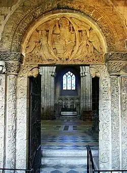 Le tympan de la porte du Prieur a une valeur particulière, car on y voit un Christ jeune et imberbe en majesté, tenant un livre avec une croix de la main gauche et bénissant de la main droite. Dans ce thème classique, le visage imberbe et la croix sont des particularités notables, comme les deux anges, dont l'un est barbu.