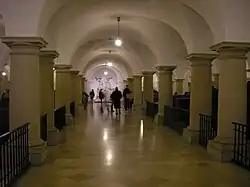 Le corps central est coiffé d'une imposante coupole ; l'espace sous celle-ci est consacré au prêche. L'aile sud comporte la chapelle des Baptêmes et des Mariages, tandis que l'aile nord abrite la chapelle funéraire.