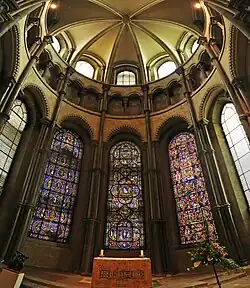 Dès 1174-1175, le programme général de plus de cent verrières pour la décoration des nouvelles constructions est fixé. La généalogie du Christ est destinée aux fenêtres supérieures du chœur, du presbytery et de la chapelle de la Trinité. Les fenêtres basses dans les collatéraux du chœur sont fondées sur l'iconographie de la Parole du Christ. Ces verrières ont été posées suivant l'avancement des travaux du chœur.