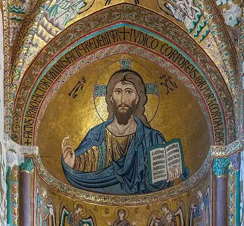 La figure dominante de l'ensemble décoratif est le Christ Pantocrator en buste sur fond d'or, portant un manteau bleu sur une tunique dorée, levant la main droite en signe de bénédiction, sur le cul-de-four de l'abside centrale. Dans sa main gauche, il tient l’Évangile de Jean, dans lequel on peut lire, en grec et en latin: « Je suis la lumière du monde, ceux qui me suivront n'erreront pas dans les ténèbres, mais auront la lumière de la vie » (Jean, 8:12). Au-dessus, sur l'extrados de l'arc marquant l'entrée de l'abside, une inscription date l'ensemble de 1148[2], légèrement postérieur aux Christs de la chapelle palatine et de la Martorana.
