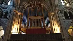 Au XVIIe siècle, la cathédrale de Durham a un orgue Smith remplacé en 1876 par un Willis avec quelques tuyaux de la chapelle du château de Durham. En 1880, Harrison and Harrison travaillent sur l'orgue avec de nombreuses modifications. Il est remis à neuf en 1996. Le buffet est conçu par C. Hogson Fowler et décoré par Clayton and Bell en 1876[13],[14]