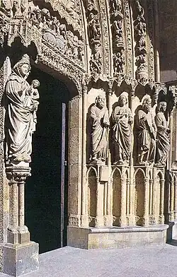 Avec cinq arches finement taillés du XIIIe siècle, trois portails d'une grande profondeur et d'une grande richesse statuaire s'intercalent deux arcades très aiguës, et une rosace centrale, flanquée par deux tours gothiques respectivement de 65 et 68 mètres. Au portail central trône Sainte Marie la Blanche, Nuestra Señora la Blanca, au doux sourire (c'est une copie : l'original se trouve dans la chapelle absidale). Les statues des jambages du portail central sont d'une élégance raffinée. Sur le linteau, le thème du Jugement Dernier, oppose de façon très expressive le sort des bienheureux et celui des réprouvés. Le tympan du portail gauche retrace divers épisodes de la vie du Christ. À droite, le portail de saint François présente la Dormition et le Couronnement de la Vierge.