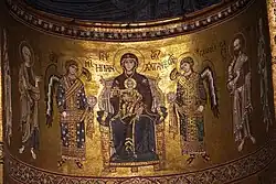 - Cul-de-four : immense Christ Pantocrator qui bénit à la grecque et coiffe le maître-autel de la cathédrale.