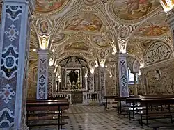 L'entrée comporte un portique avec vingt-huit colonnes antiques avec des arcs en ogive. Elle contient une série d'anciens sarcophages romains, dont l'intarsia de roche de lave, qui montre l'influence de l'art arabe.