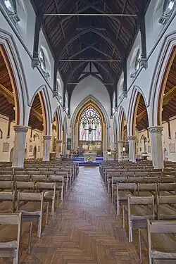 Parmi les nombreuses fenêtres à tracerie, les plus remarquables sont celles de grande taille du mur du portail et de l'autel ; les vitraux, en grande partie de Margaret Agnes Rope (en), représentent des scènes de l'histoire du salut et des martyrs anglais. Le maître-autel possède un retable en grès riche en figures. Dans l'arc du chœur se trouve un groupe de Crucifixion. Depuis le dernier réaménagement de 1984, les murs ont été blanchis à la chaux et les bords colorés.