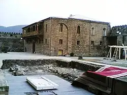 Le palais se situe dans la cour de la cathédrale, au sud de la muraille. Il date du XIe s. Dans les années 1963-1964, des fouilles archéologiques s'étendant sur 1 500 m2 ont mis au jour des ruines d'époques diverses, notamment quelques caves à vin. Les objets recueillis au cours des fouilles se trouvent au musée de Mtskheta. Sur les fondations du palais de Melkisedek (38,5 m × 18,5 m), il y a un socle de deux niveaux et un mur en grès bien taillé (jusqu’à 0,8 m d’épaisseur). Une solution de chaux est utilisée comme liant. Sur les murs de la construction : sur les façades comme à l'intérieur, il y a des pilastres tous les 3,4-3,5 m. La porte du palais (3,5 m de largeur) est située au nord. On a découvert près de celle-ci un sol en pierre de taille. Le palais est en fait bâti sur une couche plus ancienne. Sous les fondations, à 60 cm de profondeur, on a trouvé un mur (en pierre et solution à base de boue) et des céramiques datant du IXe siècle.