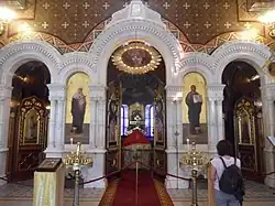 L'iconostase située à l'est de la nef est réalisée dans le style grec en marbre de Carrare[38]. Composée de cinq arcades, dont trois permettent l'accès au sanctuaire, la plus grande est fermée par la « Porte royale » uniquement accessible à l'évêque, au prêtre et au diacre[38] et surmontée d'une icône de la Cène[39]. Ouverte par deux vantaux en cyprès[38], ceux-ci sont décorés de médaillons dorés représentant les quatre Évangélistes et de deux représentations de l'Annonciation, tous signés par Luigi Rubio[39]. La « Porte royale » est encadrée de deux icônes représentant Marie et Jésus-Christ, les deux portes latérales étant décorées d'icônes de saint Étienne et sainte Hélène[39], œuvres de Nikolaï Kochelev remplaçant celles de Rubio en 1903[40].