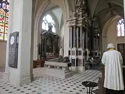 - Retable du maître-autel : Aucune inscription ne permet de le dater. Le tableau central est néanmoins signé : P. Le tourneur fecit 1640[34]. Un écu[35] du côté de l'évangile permet de cerner sa datation entre 1633 et 1640.