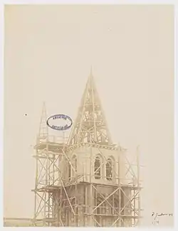 - ↑ Le plomb, dont la flèche était couverte, coule dans la rue Renaise, les cloches sont tombées et brisées. Elles ont entraînées dans leur chute le maître-autel qui se trouvait alors placé au milieu du chœur, au-dessous du clocher.