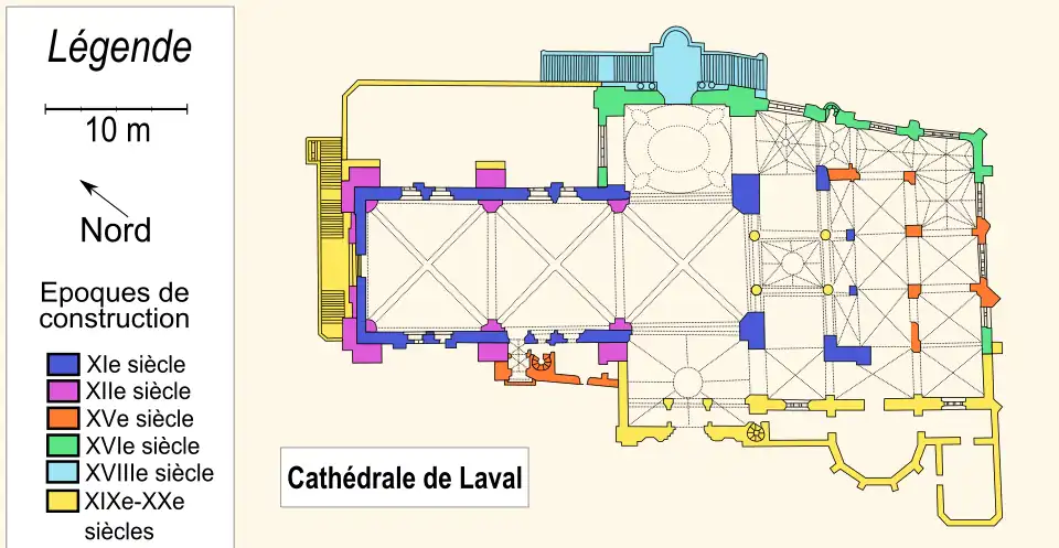 - ↑ « Cathédrale de la Sainte-Trinité de Laval », dans Alphonse-Victor Angot et Ferdinand Gaugain, Dictionnaire historique, topographique et biographique de la Mayenne, Laval, A. Goupil, 1900-1910 [détail des éditions] (BNF 34106789, présentation en ligne), tome I, p. 366.