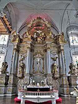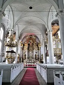 La cathédrale a un autel de 13 mètres de haut, un confessionnal, une chaire, au deuxième étage se trouve la loge des ducs de Courlande. La cathédrale se distingue particulièrement par son orgue à 131 jeux, 4 claviers et plus de 7 000 tuyaux, ce qui en fait le plus grand orgue mécanique du monde jusqu'en 19681968[2]. C'était le premier grand orgue mécanique en Lettonie et il a été fabriqué par Heinrich Andreas Contius en 1779[3],[4],[5].