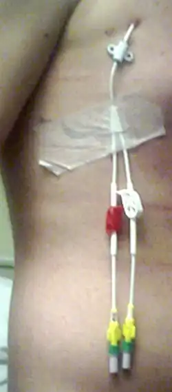 Les complications potentielles du placement d'un tel cathéter comprennent l'hémorragie et un pneumothorax lors de l'insertion et la thrombose ou une infection à un stade ultérieur. Les patients avec une cathéter tunnelisé nécessitent donc un rincement périodiques de celui-ci avec de l'héparine, pour éviter qu'il ne soit bouché par des caillots de sang.