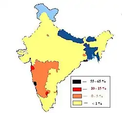 Selon le recensement de 2001, il y a environ 359 568 chrétiens à Goa[27]. De nombreux catholiques de Goa vivent à Bombay et à Bangalore. Dans les années 1960, il y a environ 100 000 catholiques goanais à Bombay, dont 90 000 dans la zone urbaine de Bombay et 10 000 dans la banlieue de Bombay[28]. D'autres régions de l'Inde qui comptent une petite proportion de catholiques goanais sont Delhi, Calcutta, Madras, Pune, Ahmednagar, Hyderabad, Nagpur, Nasik et Ranchi.