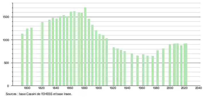 | L'évolution du nombre d'habitants est connue à travers les recensements de la population effectués dans la commune depuis 1793. Pour les communes de moins de 10 000 habitants, une enquête de recensement portant sur toute la population est réalisée tous les cinq ans, les populations de référence des années intermédiaires étant quant à elles estimées par interpolation ou extrapolation[28]. Pour la commune, le premier recensement exhaustif entrant dans le cadre du nouveau dispositif a été réalisé en 2005[29]. En 2022, la commune comptait 919 habitants[Note 4], en évolution de +5,51 % par rapport à 2016 (Lot : +1,31 %, France hors Mayotte : +2,11 %). |