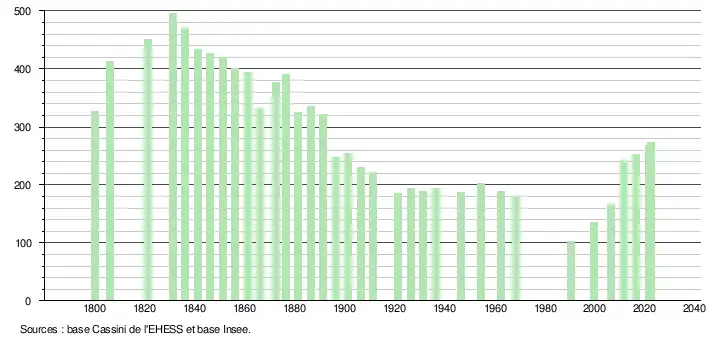 L'évolution du nombre d'habitants est connue à travers les recensements de la population effectués dans la commune depuis 1800. Pour les communes de moins de 10 000 habitants, une enquête de recensement portant sur toute la population est réalisée tous les cinq ans, les populations de référence des années intermédiaires étant quant à elles estimées par interpolation ou extrapolation[23]. Pour la commune, le premier recensement exhaustif entrant dans le cadre du nouveau dispositif a été réalisé en 2006[24].