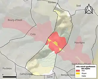 La commune est vulnérable au risque de mouvements de terrains constitué principalement du retrait-gonflement des sols argileux[26]. Cet aléa est susceptible d'engendrer des dommages importants aux bâtiments en cas d’alternance de périodes de sécheresse et de pluie. 20,5 % de la superficie communale est en aléa moyen ou fort (88,8 % au niveau départemental et 48,5 % au niveau national). Sur les 19 bâtiments dénombrés sur la commune en 2019, 19 sont en aléa moyen ou fort, soit 100 %, à comparer aux 98 % au niveau départemental et 54 % au niveau national. Une cartographie de l'exposition du territoire national au retrait gonflement des sols argileux est disponible sur le site du BRGM[27],[Carte 4].