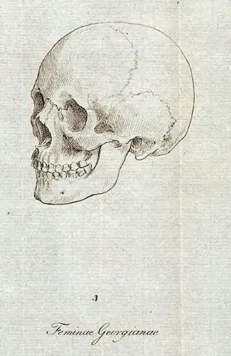 - ↑ « Speciminis loco inservit feminae georgianae elegantissimum cranium. », ce qui pourrait être approximativement traduit par « Le crâne de ce spécimen de femme géorgienne est le plus élégant. » (la) Johann Friedrich Blumenbach, De generis humani varietate nativa (lire en ligne), p. 206