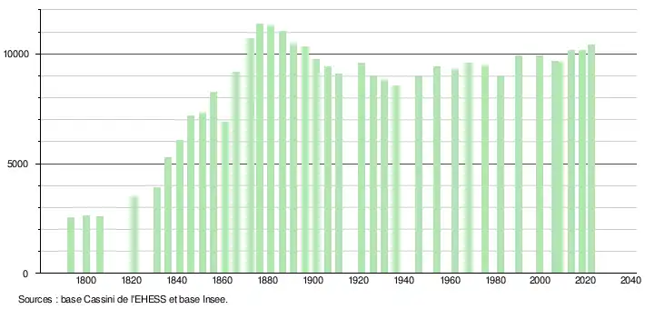 L'évolution du nombre d'habitants est connue à travers les recensements de la population effectués dans la commune depuis 1793. Pour les communes de moins de 10 000 habitants, une enquête de recensement portant sur toute la population est réalisée tous les cinq ans, les populations de référence des années intermédiaires étant quant à elles estimées par interpolation ou extrapolation[32]. Pour la commune, le premier recensement exhaustif entrant dans le cadre du nouveau dispositif a été réalisé en 2008[33].