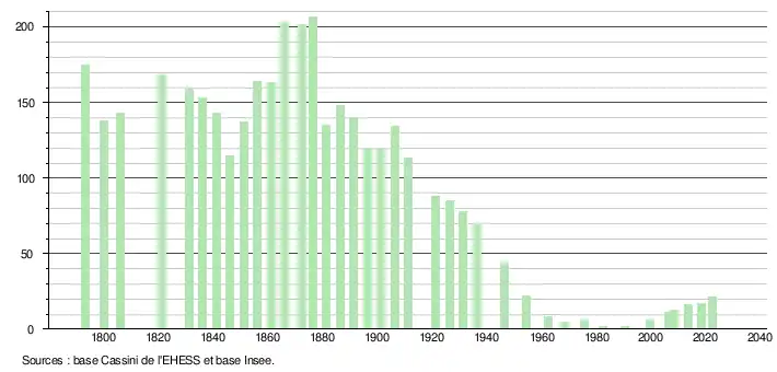 L'évolution du nombre d'habitants est connue à travers les recensements de la population effectués dans la commune depuis 1793. Pour les communes de moins de 10 000 habitants, une enquête de recensement portant sur toute la population est réalisée tous les cinq ans, les populations de référence des années intermédiaires étant quant à elles estimées par interpolation ou extrapolation[39]. Pour la commune, le premier recensement exhaustif entrant dans le cadre du nouveau dispositif a été réalisé en 2008[40].