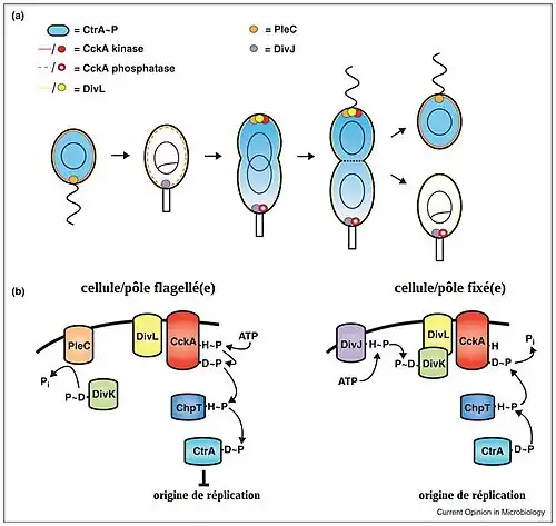 Au niveau protéique, une des différences entre la cellule mobile et la cellule fixée est la concentration en CtrA phosphorylée, protéine régulant la réplication cellulaire. La phosphorylation de la protéine CtrA est contrôlée par un complexe de phosphorelais, dont une unité diverge entre la future cellule flagellée et la future cellule pédonculée. Basiquement, la phosphorylation de CtrA est initiée par la protéine régulatrice Ccka et passe par l'intermédiaire d'une protéine ChpT. L'activation de Ccka dépend de son interaction avec la protéine DivL, complexe qui peut être inhibée par la protéine DivK. Enfin, la phosphorylation de DivK est contrôlée par la phosphatase PleC au pôle de la future cellule mobile et par la kinase DivJ au pôle de la future cellule fixée. La protéine PleC désactive DivK, DivK n'inhibe plus Ccka-DivL, Ccka en tant que kinase est activée et permet la phosphorylation de CtrA, ce qui empêche l'initiation de la réplication dans la future cellule mobile. La protéine DivJ active DivK, DivK peut inhiber Ccka-DivL, Ccka permet la déphosphorylation de CtrA, ce qui permet l'initiation de la réplication dans la future cellule fixée[15].