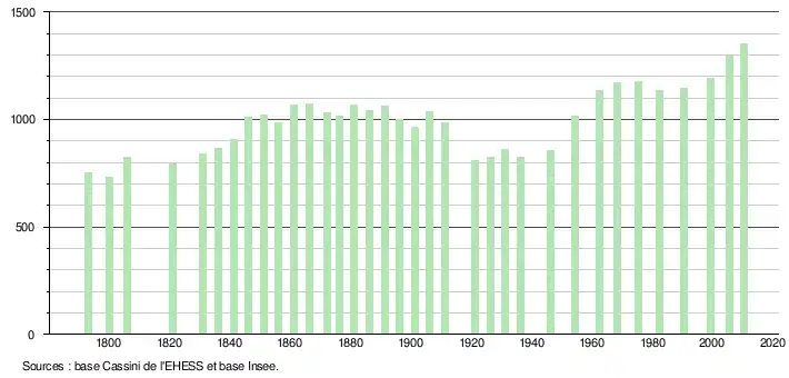 - ↑ Par convention dans Wikipédia, le principe a été retenu de n’afficher dans le tableau des recensements et le graphique, pour les populations légales postérieures à 1999, que les populations correspondant à une enquête exhaustive de recensement pour les communes de moins de 10 000 habitants, et que les populations des années 2006, 2011, 2016, etc. pour les communes de plus de 10 000 habitants, ainsi que la dernière population légale publiée par l’Insee pour l'ensemble des communes.