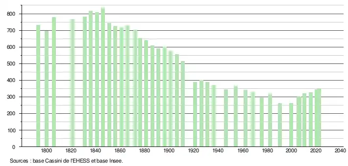 L'évolution du nombre d'habitants est connue à travers les recensements de la population effectués dans la commune depuis 1793. Pour les communes de moins de 10 000 habitants, une enquête de recensement portant sur toute la population est réalisée tous les cinq ans, les populations de référence des années intermédiaires étant quant à elles estimées par interpolation ou extrapolation[27]. Pour la commune, le premier recensement exhaustif entrant dans le cadre du nouveau dispositif a été réalisé en 2005[28].