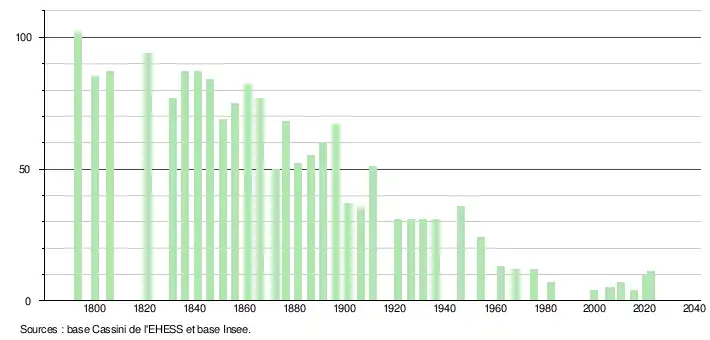 L'évolution du nombre d'habitants est connue à travers les recensements de la population effectués dans la commune depuis 1793. Pour les communes de moins de 10 000 habitants, une enquête de recensement portant sur toute la population est réalisée tous les cinq ans, les populations de référence des années intermédiaires étant quant à elles estimées par interpolation ou extrapolation[30]. Pour la commune, le premier recensement exhaustif entrant dans le cadre du nouveau dispositif a été réalisé en 2005[31].