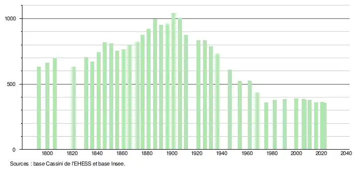 - ↑ Fiches Insee - Populations de référence de la commune pour les années 2006, 2007, 2008, 2009, 2010, 2011, 2012, 2013, 2014, 2015, 2016, 2017, 2018, 2019, 2020, 2021 et 2022.
