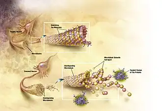 L'hypothèse de la protéine Tau suggère qu'une anomalie avec cette protéine amorce la cascade de la maladie. Dans ce modèle, une hyperphosphorilation de la protéine Tau commence à s'apparier à d'autres filaments de Tau. Finalement, ils forment un enchevêtrement neurofibrillaire à l'intérieur du corps des cellules nerveuses. Quand cela se produit, le microtubule se désintègre, détruisant au passage la structure du cytosquelette cellulaire qui provoque l'effondrement du système de transport du neurone. Cela se traduit d'abord par des dysfonctions dans les communications biochimiques entre les neurones et plus tard par la mort cellulaire.
