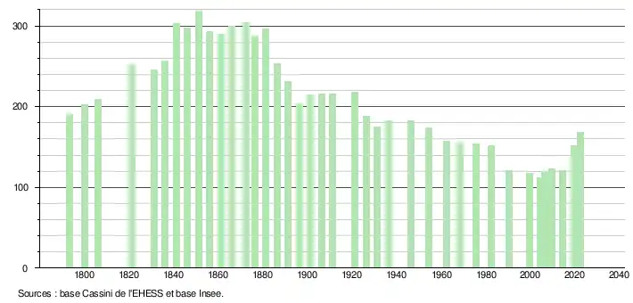 L'évolution du nombre d'habitants est connue à travers les recensements de la population effectués dans la commune depuis 1793. Pour les communes de moins de 10 000 habitants, une enquête de recensement portant sur toute la population est réalisée tous les cinq ans, les populations de référence des années intermédiaires étant quant à elles estimées par interpolation ou extrapolation[18]. Pour la commune, le premier recensement exhaustif entrant dans le cadre du nouveau dispositif a été réalisé en 2004[19].