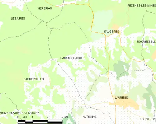 Caussiniojouls se situe au sud de Bédarieux, à proximité de Laurens et Faugères.