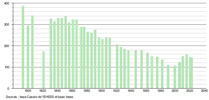 L'évolution du nombre d'habitants est connue à travers les recensements de la population effectués dans la commune depuis 1793. Pour les communes de moins de 10 000 habitants, une enquête de recensement portant sur toute la population est réalisée tous les cinq ans, les populations de référence des années intermédiaires étant quant à elles estimées par interpolation ou extrapolation[25]. Pour la commune, le premier recensement exhaustif entrant dans le cadre du nouveau dispositif a été réalisé en 2005[26].
