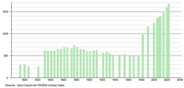 L'évolution du nombre d'habitants est connue à travers les recensements de la population effectués dans la commune depuis 1793. Pour les communes de moins de 10 000 habitants, une enquête de recensement portant sur toute la population est réalisée tous les cinq ans, les populations de référence des années intermédiaires étant quant à elles estimées par interpolation ou extrapolation[25]. Pour la commune, le premier recensement exhaustif entrant dans le cadre du nouveau dispositif a été réalisé en 2004[26].