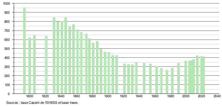 L'évolution du nombre d'habitants est connue à travers les recensements de la population effectués dans la commune depuis 1793. Pour les communes de moins de 10 000 habitants, une enquête de recensement portant sur toute la population est réalisée tous les cinq ans, les populations de référence des années intermédiaires étant quant à elles estimées par interpolation ou extrapolation[23]. Pour la commune, le premier recensement exhaustif entrant dans le cadre du nouveau dispositif a été réalisé en 2004[24].